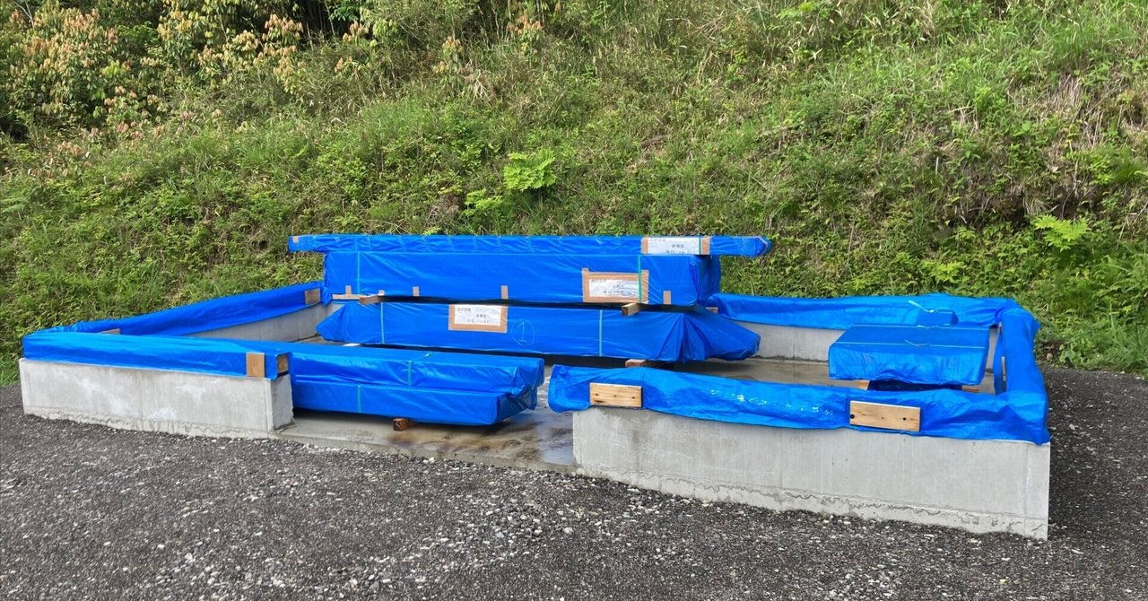 昨日(5/8)加工された木材が現地に到着しました。 来る5月11日(土)の建方(上棟)に向け、10日には足場を組立てますので、柱とか中に入れておくべき材木を取り込んだ状態です。 昨日この写真が棟梁から届いて気づいたのですが、裏山の草を刈って...